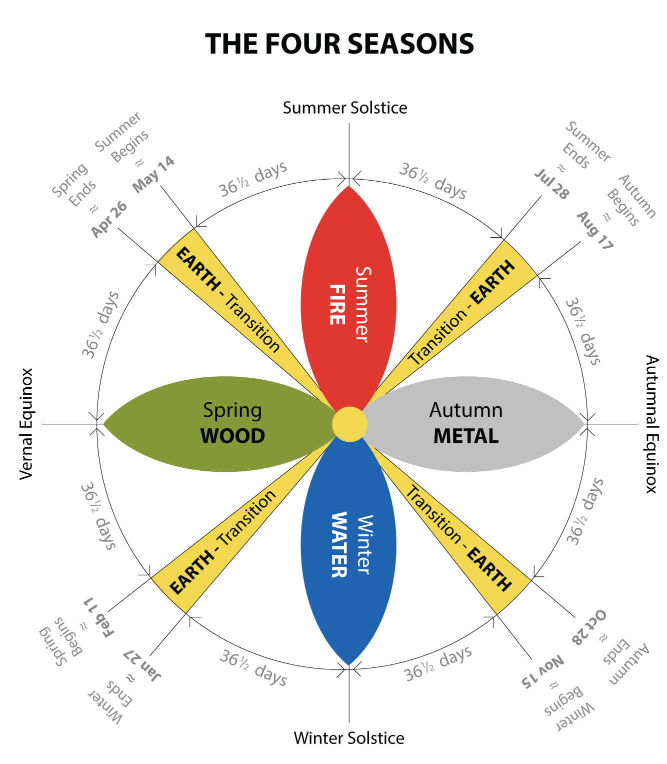 We can use the example of baking a cake to help clarify. The winter (Water) phase of the baking process is the part where you are sitting on the couch with a cup of tea and your favorite cookbooks spread out all around you. You are leafing through, looking at the pictures, and when one catches your eye, you read through the recipe to see how complicated it is, mull over the merits of chocolate versus carrot, and whether you have the ingredients. This is how you gather the potential energy and resources required to make a cake in the form of know-how and ingredients. As soon as you get up off the couch and head for the kitchen, you are in the early spring (Wood) phase because there is movement, the beginning of something actually happening that is visible to the outside world. Your energy has moved up off the couch and out of the living room. It is that up and out energy that we recognize as spring (Wood) energy.